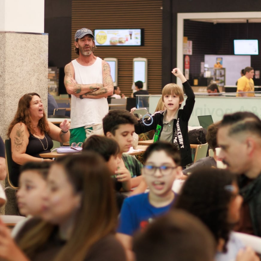 Todos participam usando o próprio celular, direto da plateia. Basta estar presente no local e aproveitar a chance de jogar e competir em tempo real junto com todos.